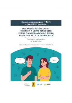 Dans le cadre de notre partenariat avec Octav, des ambassadeurs du tri effectueront sur la commune de Salinelles un porte à porte le vendredi 31 octobre de 8h30 à 15h30 afin de rappeler les consignes tri et d’évoquer le compostage collectif.