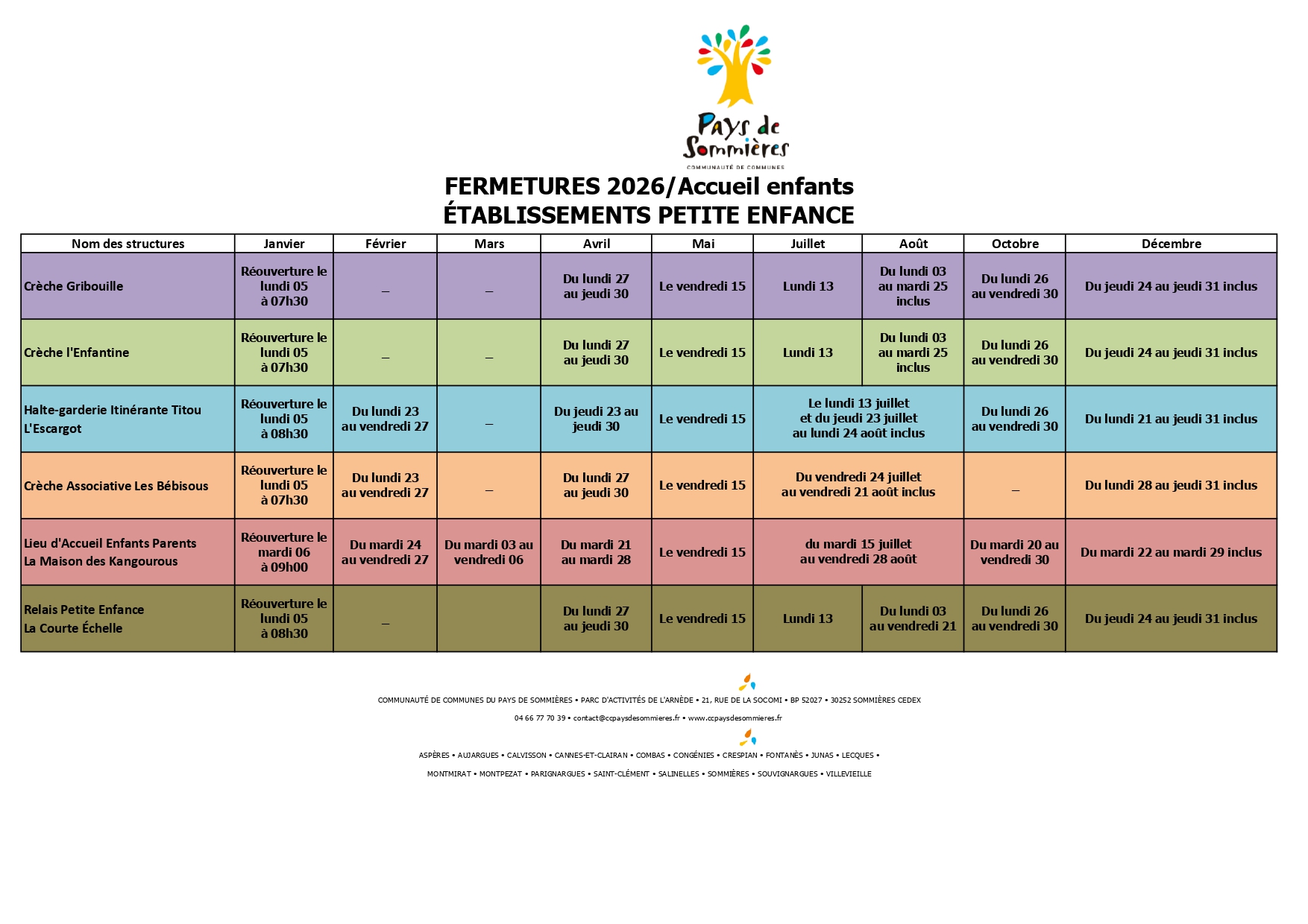 Vous êtes ici : Accueil > Planning des fermetures 2026 - Structures Petite Enfance